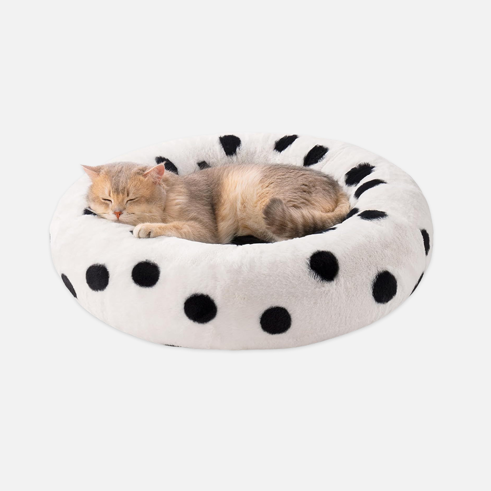 The MEWOOFUN Donut Cat Bed offers your pet the ultimate comfort with its soft, round edges that provide a gentle hug for your pet’s head and neck. Filled with a blend of chopped foam and polyfill, this bed offers superior joint support and comfort, ensuring your furry friends get a restful sleep. Measuring 23x23 inches, it’s ideal for cats and small dogs up to 25 lbs. With its stylish black dot design, this bed fits perfectly in modern home settings. The non-slip bottom ensures stability, and the hidden zipper allows for easy cleaning, making it both practical and comfortable.
